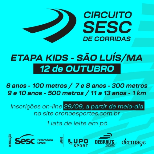 - O Evento Esportivo “Circuito Sesc de Corridas - KIDS”, é uma iniciativa do Sesc no Maranhão que tem por objetivo incentivar a prática de atividades físicas e adoção de hábitos saudáveis na data do dia das crianças, proporcionando provas de corrida de rua, com qualidade técnica, envolvendo aspectos lúdicos, educativos e de integração do esporte. O evento será realizado no dia 12 de outubro de 2025, ás 16h, na Reserva do itapiracó, fica próximo ao Rio Anil Shopping, São Luís - MA, em qualquer condição climática, com participação de crianças devidamente inscritas.