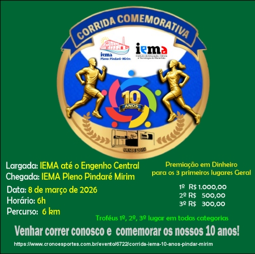 - Essa é a Corrida em comemoração aos 10 anos do IEMA, será realizada em Pindaré-Mirim, idealizada pela gestão do IEMA de Pindaré, com apoio da CRONO ESPORTES, será realizada com o intuito de promover saúde e confraternizar com seus atletas, participe!.