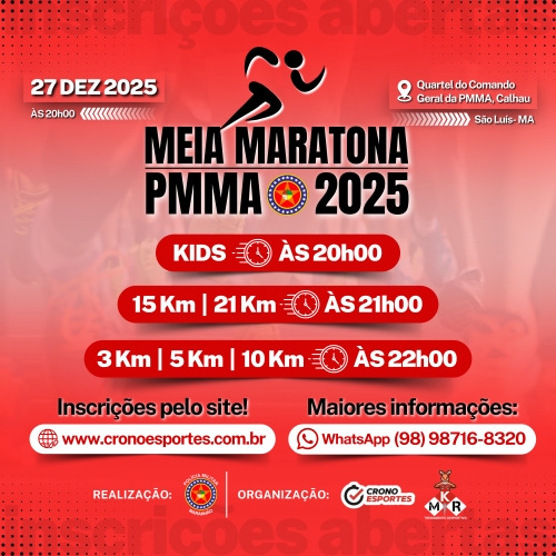 - A Meia Maratona da PMMA, será promovida pela Policia Militar do Maranhão e MKR TREINAMENTO DESPOSTIRVO, com organização da CRONO ESPORTES, visando incentivar a prática da atividade física e garantir a qualidade de vida dos participantes, integrando PMMA com a sociedade civil.